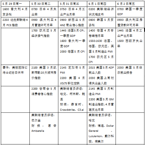 本周看点颇多,美国债务上限协议表决值得关注,5月非农就业报告将影响外界对下月政策立场的预期。欧元区经济面临考验,最新通胀数据能否缓解欧央行政策压力。产油国组织OPEC+部长级会议将召开,后续生产计划值得关注。